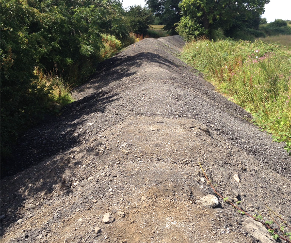 Since the summer, the lane has been filled with spoil, identified by a local dog-walking resident as ‘road planings’ – the old tarmac surface taken up before a new surface is laid.